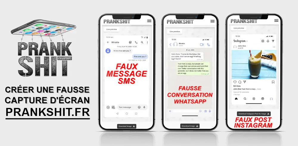 Vous souhaitez vous justifier ou blaguer votre entourage ? Sur Prankshit, vous pouvez créer de fausses conversations. Capturer un moment, immortaliser une conversation ou préserver un souvenir numérique, les captures d’écran se sont imposées comme un outil quotidien essentiel dans notre communication digitale. Prankshit élève cette pratique à un niveau supérieur en proposant un service unique : la création de fausses captures d’écran. Sa fonctionnalité exclusive permet de générer des imitations convaincantes de conversations SMS, d’e-mails, d’historiques d’appels, et même de publications sur Instagram, Facebook, Twitter et autres réseaux sociaux. Avec Prankshit, la seule limite est votre imagination.