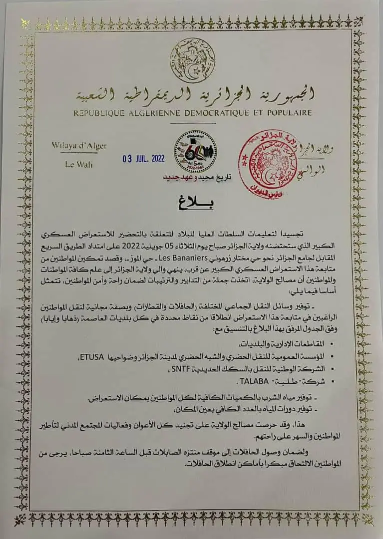 À l’occasion de la célébration du 60e anniversaire de l’indépendance ; l’Armée nationale populaire (ANP) organisera demain, mardi 5 juillet ; un défilé militaire au niveau de la RN 11 à Alger. À cet effet ; les services de la wilaya d’Alger ont annoncé la mise à disposition gratuite des moyens de transport ; afin de permettre aux citoyens d’assister au défilé de l’ANP.