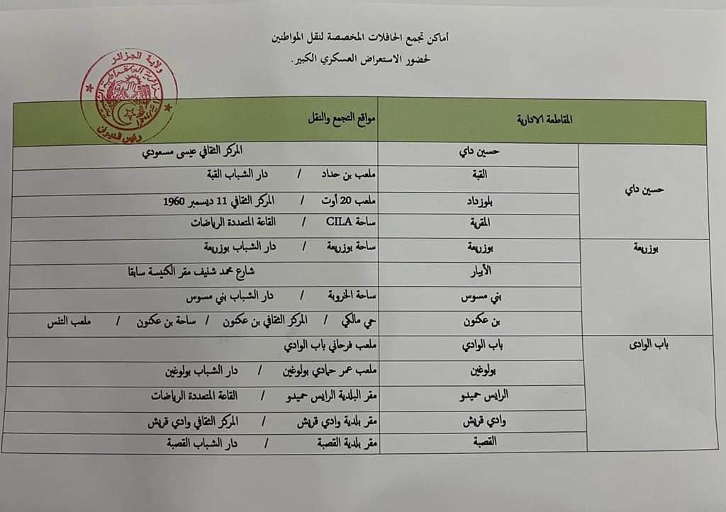 Selon le même communiqué ; la wilaya d’Alger a mis à disposition les différents moyens de transport collectif par bus et par trains. Et ce, gratuitement pour assurer l’aller et le retour des citoyens à partir des différentes communes de la capitale vers le lieu du défilé.