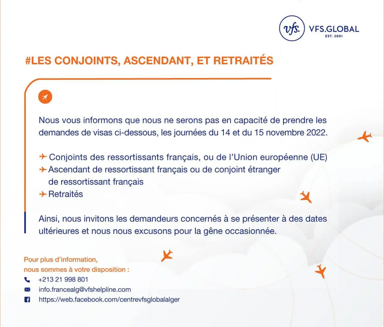 Le centre de dépôt des demandes de visa pour la France à Alger, VFS Global, a rendu public ce dimanche, 23 octobre 2022, deux notes importantes relatives aux demandes de visas qui concernent différentes catégories de personnes.