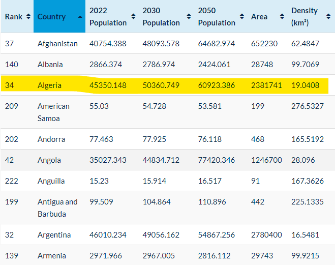 En Afrique du Nord, en revanche, l’Algérie représente le 2e pays le plus peuplé après l’Égypte. Le Maroc se classe 39e avec 37 millions d’habitants ; la Tunisie, 79e avec 12 millions d’habitants ; la Libye, 107e avec 7 millions d’habitants ; la Mauritanie 126e avec 4,9 millions d’habitants.