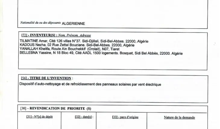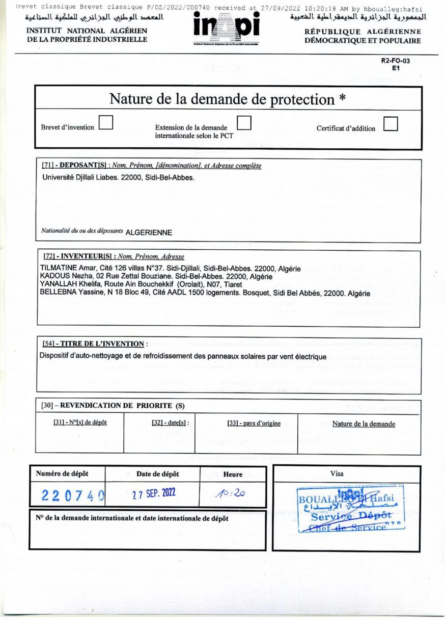 En la date du 23 novembre 2022, le laboratoire APELEC a annoncé sur sa page Facebook officielle le dépôt d’un brevet à l’Institut national algérien de la propriété intellectuelle (INAPI) avec extension à l’international (dépôt en PCT au niveau de l’Organisation mondiale de la propriété intellectuelle [OMPI]). L’invention porte le titre de « Dispositif d’autonettoyage et de refroidissement des panneaux solaires par vent électrique ».