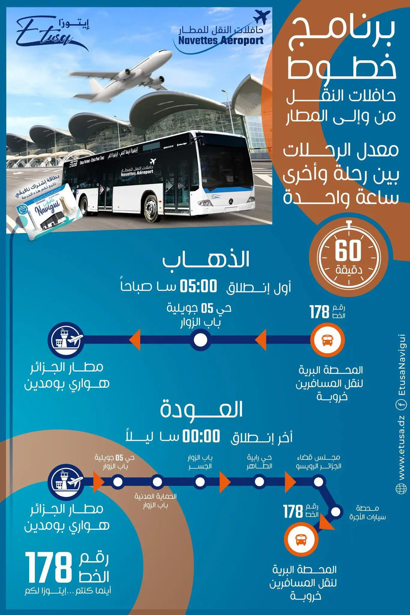 L’Établissement Public de Transport Urbain et Suburbain d’Alger (ETUSA) a annoncé les détails des horaires des lignes de bus n° 100 et n° 178, reliant l’aéroport international d’Alger – Houari Boumédiène – à la Place des Martyrs et à la gare routière de Kharouba.
