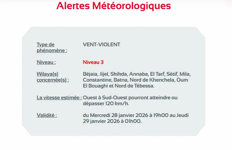 🟢 A LIRE AUSSI : Vents à plus de 90 km/h et fortes pluies ce lundi 26 janvier : quelles wilayas sont en alerte météo ?