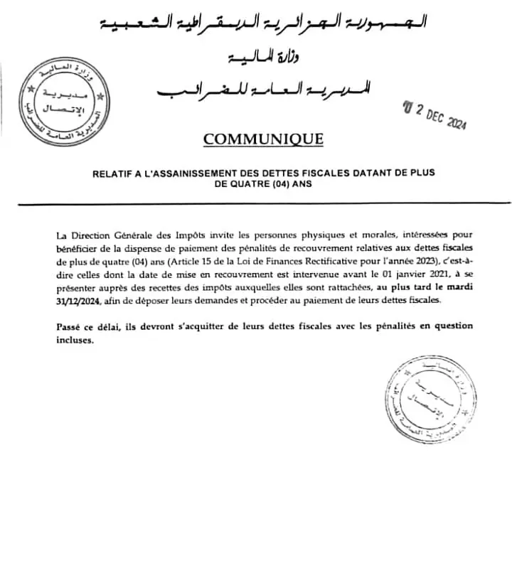 “La Direction Générale des Impôts invite les personnes physiques et morales, intéressées pour bénéficier de la dispense de paiement des pénalités de recouvrement relatives aux dettes fiscales de plus de quatre (04) ans… à se présenter auprès des recettes des impôts auxquelles elles sont rattachées, ”, indique le communiqué publié ce matin sur sa page Facebook.