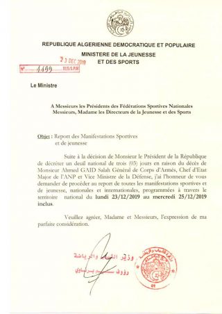 Dans une note envoyée aux présidents des fédérations sportives nationales et aux directeurs de la jeunesse et des sports, le ministre de la jeunesse et des sports M. Bernaoui Raouf Salim a demandé « de procéder au report toutes les manifestations sportives et de jeunesses, nationales et internationales, programmées à travers le territoire national du lundi 23/12/2019 au mercredi 25/12/2019 inclus ».