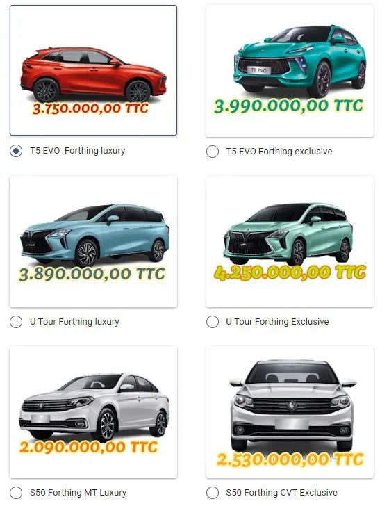 En effet, la marque chinoise DF Joyear a dévoilé les prix de ces modèles de voitures, disponibles en précommande en Algérie. Il s’agit des trois modèles phares, qui sont désormais disponibles en précommande en remplissant un formulaire sur le site de la marque, à savoir :