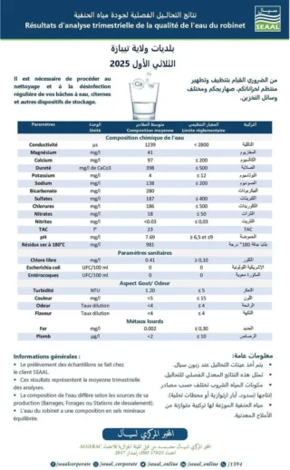 Les prélèvements ont été effectués directement chez les consommateurs afin de mesurer avec précision le niveau de qualité de l’eau au point d’usage. Les résultats ont été validés par le laboratoire central de SEAAL, certifié selon la norme ISO/CEI 17025 version 2017 par l’organisme national d’accréditation ALGERAC. La société souligne que ces tests confirment le respect strict des normes algériennes et internationales en matière de potabilité.