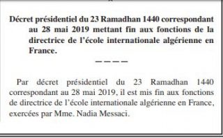 « Par décret présidentiel du 23 Ramadhan 1440 correspondant au 28 mai 2019, il est mis fin aux fonctions de directrice de l’école internationale algérienne en France, exercées par Mme. Nadia Messaci », lit-ont dans le journal officiel n° 37 daté du 9 juin 2019.