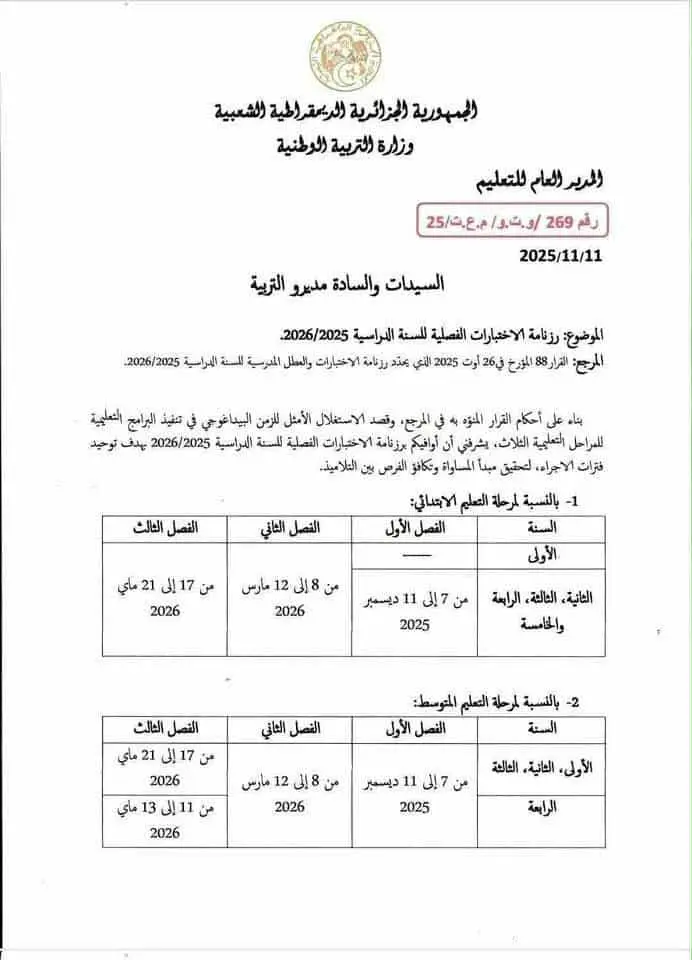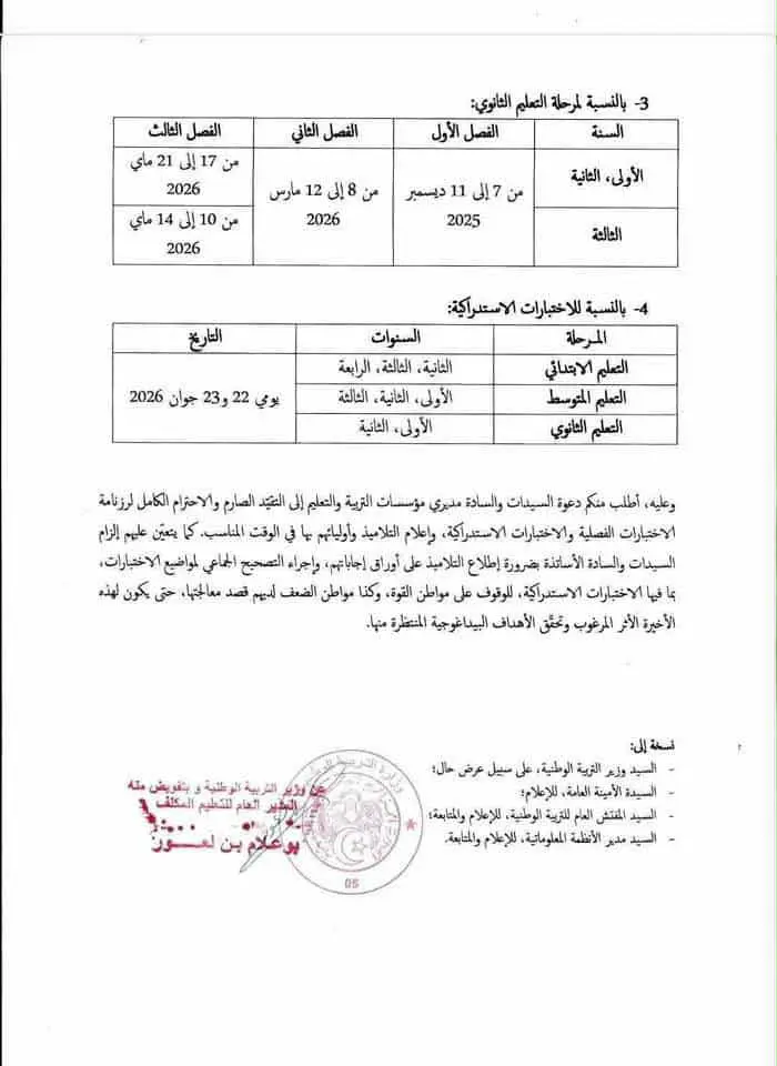 Le ministère de l’Éducation nationale a rappelé aux directeurs d’établissements la nécessité de se conformer strictement et intégralement à ce calendrier. Il a également insisté sur l’importance d’informer les parents en temps opportun, et d’obliger les enseignants à présenter les copies corrigées aux élèves, et à procéder à une correction collective des sujets pour identifier et traiter les lacunes, afin d’atteindre les objectifs pédagogiques visés.