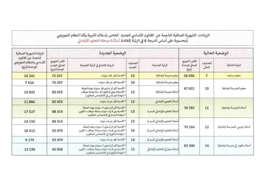 Dans une lettre adressée aux enseignants, le ministère a détaillé les « avantages, améliorations et nouveautés » introduites par le nouveau statut fondamental et le nouveau régime indemnitaire. Trois tableaux ont été publiés, détaillant les augmentations et les salaires résultants, du primaire au secondaire.