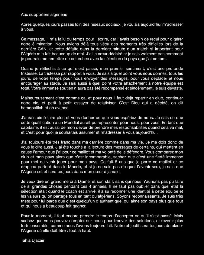 Mahrez s’est excusé auprès du public algérien en rappelant son envie de dessiner le sourire sur les visages de tous les Algériens et sa conscience de l’enthousiasme qui accompagne tous les matchs de la sélection « Quand je réfléchis à ce qui s’est passé, mon premier sentiment, c’est une profonde tristesse. La tristesse par rapport à vous. Je sais à quel point vous nous donnez, tous les jours, de votre temps pour nous envoyer des messages, pour vous déplacer et nous encourager au stade. Je sais aussi à quel point votre attachement à notre équipe est total. Votre immense soutien n’aura pas été récompensé et sincèrement, je suis dévasté. Malheureusement, c’est comme ça, et pour nous il faut déjà repartir en club, continuer notre vie, et petit à petit essayer de relativiser. C’est Dieu qui a décidé, on dit hamdoulilah et on avance » ajoute-t-il.