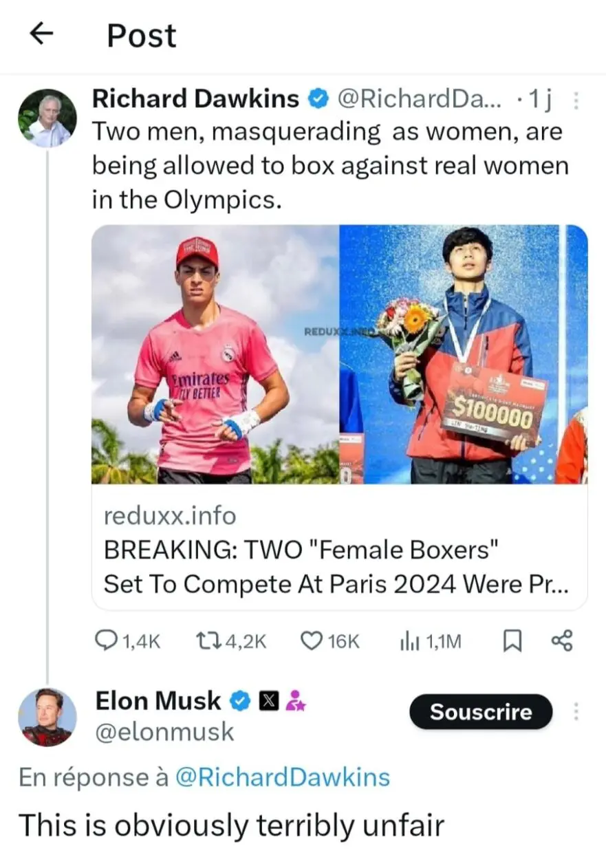 Le site Reduxx a été le premier à lancer ces accusations, affirmant qu’Imane Khelif, ainsi que la boxeuse taïwanaise Lin Yu Ting, se « déguisaient » en femmes pour participer aux Jeux Olympiques. Ces allégations ont rapidement été reprises et amplifiées par des personnalités influentes, dont Elon Musk, le propriétaire de Twitter (désormais X). Le milliardaire a qualifié cette situation de « manifestement injuste » !