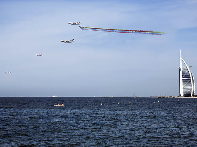 Deux Airbus A380 d’Emirates Airlines et Etihad Airways, et pour les low cost un A320 d’Air Arabia et un Boeing 737 MAX 8 de Flydubai ont effectué un vol en formation avec les sept avions de l’équipe de voltige Al Fursan, à l’occasion du 47eme anniversaire de s Emirats Arabes Unis.