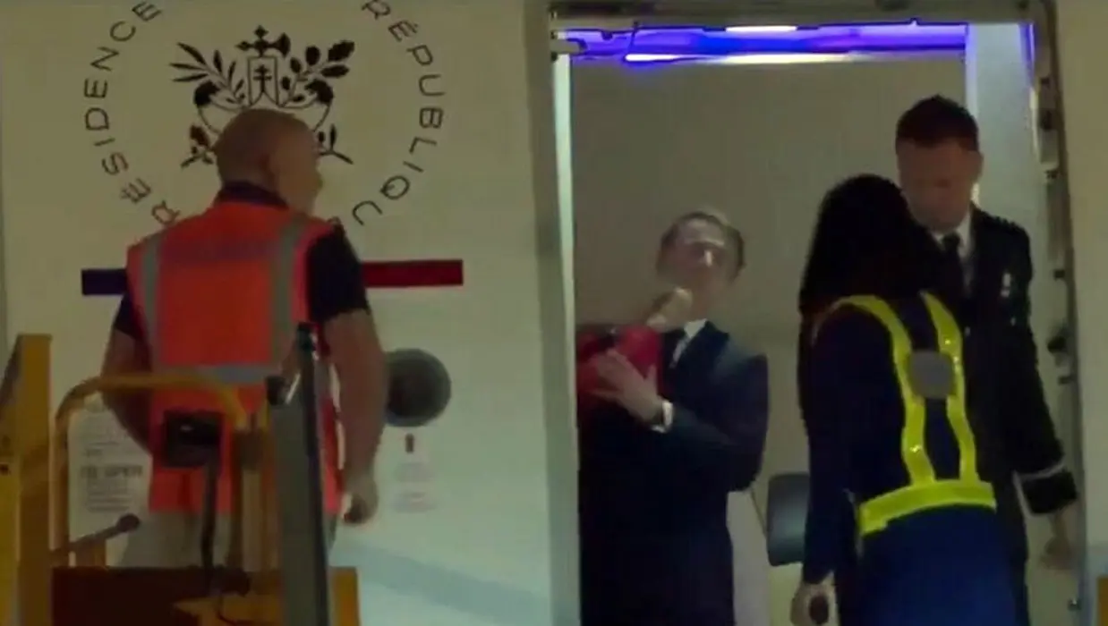 Le couple présidentiel s’engage dans l’escalier de l’avion, Emmanuel Macron tend le bras à son épouse Brigitte, comme à son habitude, mais cette dernière l’ignore et se tient à la main courante de la passerelle.