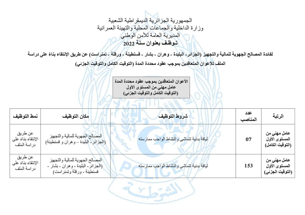 La même source a fait savoir que le recrutement se fera sur la base de l’étude du dossier de chaque candidat. On notera également que cette campagne de recrutement se fera au profit des directions générales des finances et de l’équipement de 7 wilayas. À savoir Alger, Blida, Oran, Béchar, Constantine, Ouargla et Tamanrasset.