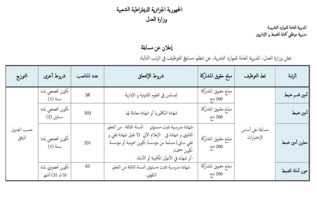 Le Ministère de la Justice a dévoilé une opportunité de carrière majeure avec l’annonce d’un concours de recrutement comprenant un total de 654 postes dans le domaine du greffe. Dans un communiqué rendu public hier, lundi, le ministère a révélé les spécialités demandées, les wilayas concernées, ainsi que la procédure à suivre pour candidater.