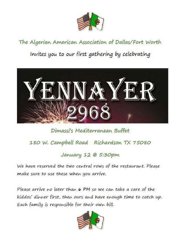 Samedi 12 janvier ,la communauté algérienne établie à Dallas, communément appelé Dallas–Fort Worth metroplex, s’est retrouvé dans un restaurant de la ville pour célébrer Yennayer. Une réservation de 60 personnes a été faite en premier lieu, mais c’est finalement 80 personnes qui sont venues, parfois de loin, pour participer à l’événement qui a réuni plusieurs familles algériennes.