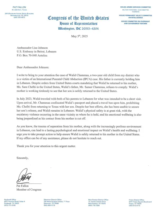 Le dossier est remonté jusqu’au Congrès américain. Le représentant Pat Fallon a personnellement écrit à l’ambassadrice des USA au Liban, qualifiant Walid de « victime d’enlèvement » et s’inquiétant pour sa sécurité physique immédiate. Malgré l’implication du FBI et du Département d’État américain, les leviers d’action restent limités.