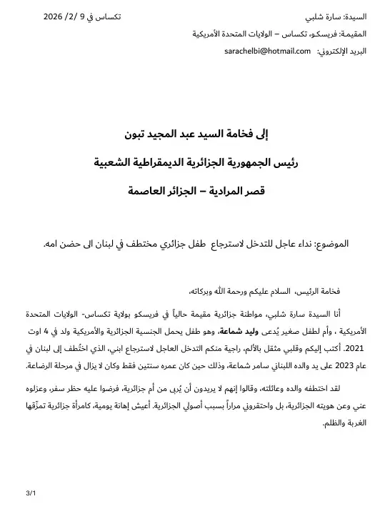 Des échanges ont déjà eu lieu avec le Consulat Général d’Algérie à New York, qui a confirmé suivre le dossier et avoir transmis les informations à l’Ambassade d’Algérie à Beyrouth, mais sans aucune suite. Le temps presse, chaque jour passé est un jour de trop pour un enfant de quatre ans, privé de sa mère. Sara Chelbi ne demande qu’une chose, l’application du droit et le retour de son fils sain et sauf.