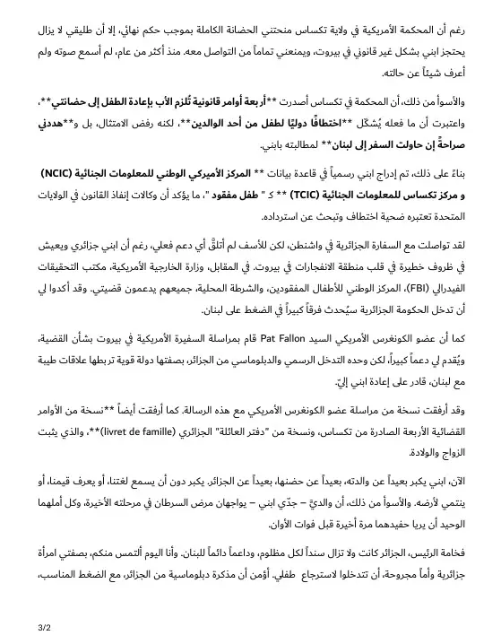 Face à l’impuissance de l’administration américaine à faire exécuter le jugement sur le sol libanais, Sara Chelbi se tourne aujourd’hui vers sa patrie. Elle lance un appel solennel aux autorités algériennes, et particulièrement au Président de la République et au Ministère des Affaires Étrangères.