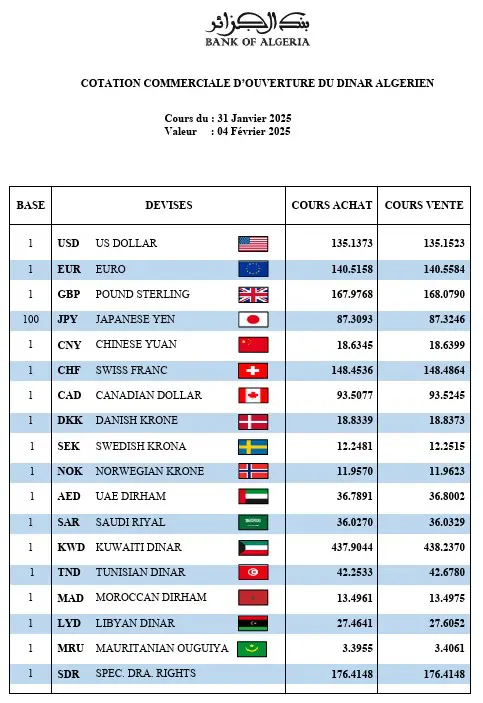 Du côté des cotations officielles, la Banque d’Algérie affiche une stabilité notable pour la période allant du 31 janvier au 4 février 2025. L’euro se fixe à 140,51 dinars à l’achat et 140,55 dinars à la vente, alors que le dollar américain s’échange à 135,13 dinars à l’achat et 135,15 dinars à la vente.