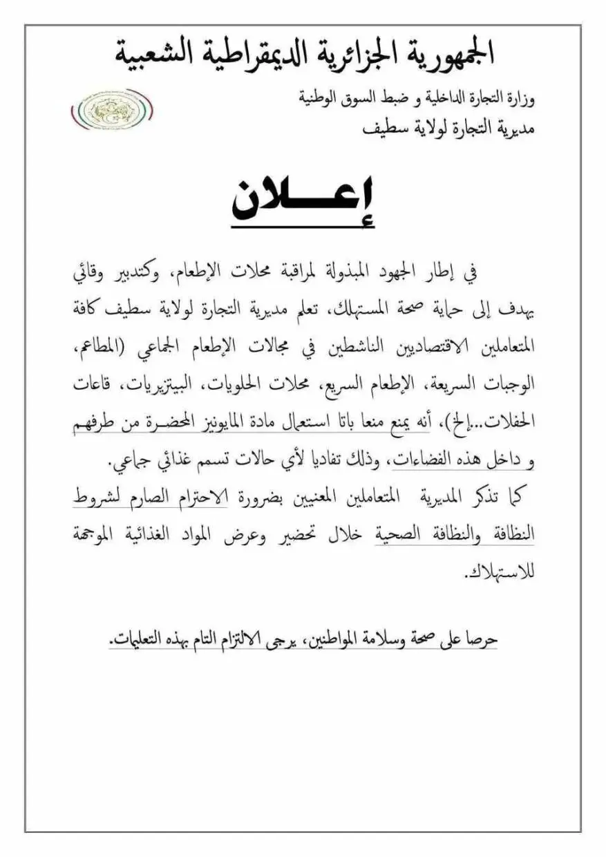 Dans une décision visant à prévenir les intoxications alimentaires collectives, la Direction du Commerce de la wilaya de Sétif a émis un avis formel interdisant l’utilisation de mayonnaise « faite maison » dans tous les établissements de restauration collective, des restaurants classiques aux fast-foods, en passant par les pâtisseries et les salles des fêtes.