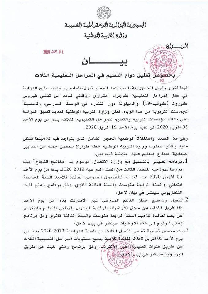 Pour rappel, le chef de l’Etat, Abdelmadjid Tebboune, a annoncé, mardi dernier, lors de sa rencontre avec les médias, la prolongation de la fermeture des écoles, des Universités et des centres de formation professionnelle et ce, dans le cadre des mesures de prévention et de lutte contre la propagation du Coronavirus.