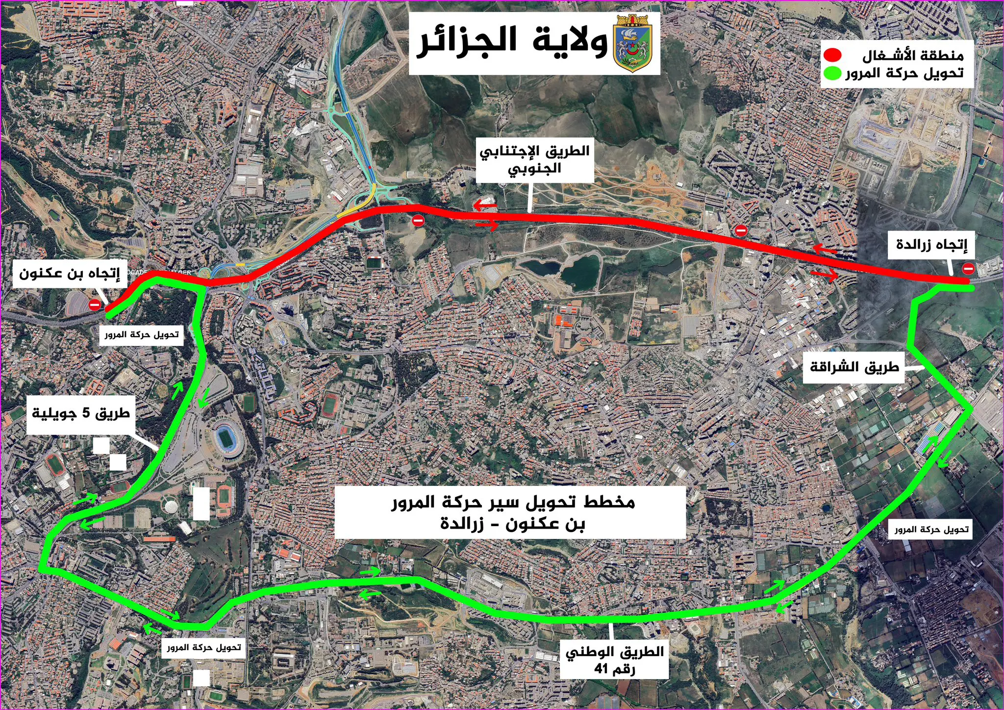 Quant à ceux venant de Dar El Beïda en direction de Zéralda, la circulation sera déviée « vers l’échangeur de l’autoroute du 5-Juillet, puis vers la RN 41 en passant par Chevalley et Chéraga, avant d’emprunter la RN 36 jusqu’à la rocade sud ».