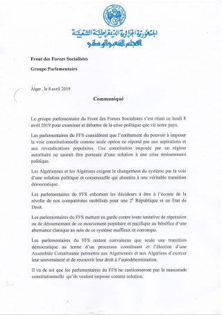 Les parlementaires du FFS mettent en garde contre toute tentative de répression ou de détournement de ce mouvement populaire et pacifique au bénéfice d’une alternance clanique au sein de ce système maffieux et corrompu.