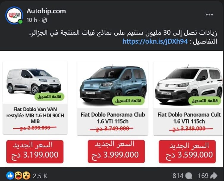 D’après le site spécialisé Autobip.com, le constructeur automobile Fiat Algérie aurait modifié son positionnement tarifaire sur le marché national. Une révision de la grille de prix touche spécifiquement les modèles Doblò assemblés localement, dans leurs versions utilitaire et familiale.