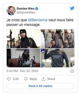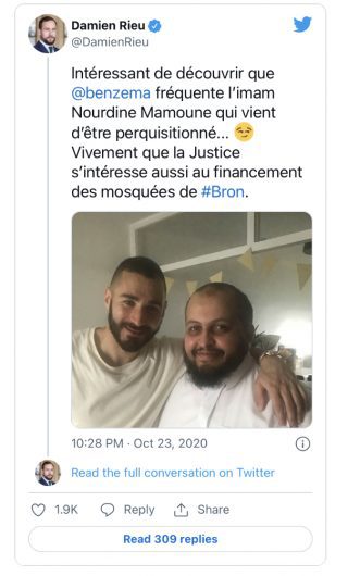 Le premier a été publié le 23 octobre 2020, et l’ancien porte-parole y mentionne clairement le joueur, sous entendant une implication dans l’affaire de l’assassinat du professeur Samuel Paty. Accompagné d’une photo de Karim avec l’imam Nourdine Mamoune, Rieu poste « Intéressant de découvrir que @benzema fréquente l’imam Nourdine Mamoune qui vient d’être perquisitionné (une opération menée trois jours après l’assassinat de Samuel Paty qui n’avait débouché sur aucune poursuite). Vivement que la justice s’intéresse aussi au financement des mosquées de Bron (ville du Rhône d’où est originaire Benzema) ».