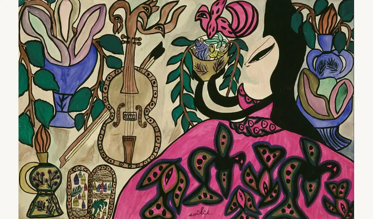 Il s’agit de la collection « Femmes en leur jardin » de Baya, de son vrai nom, Fatma Haddad. Ces œuvres subliment des femmes mises en scène dans des jardins d’Éden, entourées d’instruments de musiques, d’oiseaux, et de plusieurs autres éléments appelant à découvrir les touches d’une femme singulière.