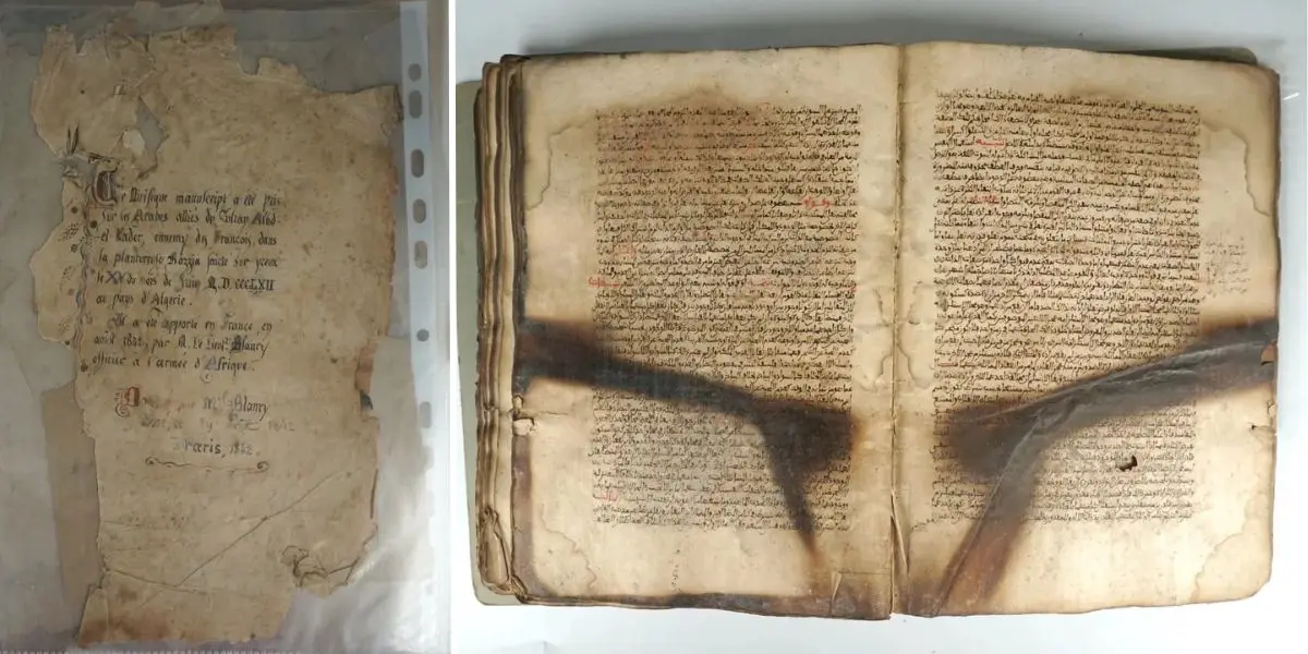 Le texte de présentation du site qui propose le manuscrit à la vente explique que le document avait été saisi par les armées de l’occupation française lors d’un raid contre une tribu qui faisait paître ses moutons dans la région en juin 1842. L’officier français, le lieutenant Planry, avait ensuite emmené le manuscrit en France avant qu’il ne soit consacré le 29 août 1842 à Paris.