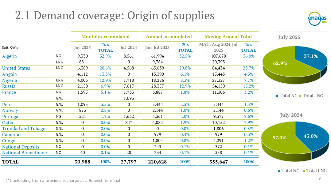 En comparaison, les États-Unis ont fourni 20,6 % du gaz consommé par l’Espagne sur la même période, soit 6 389 GWh, en forte hausse (+55 % par rapport à juin). Sur les sept premiers mois de 2025, Alger conserve également sa position dominante avec 32 % de parts de marché, devant Washington (28,9 %) et la Russie.