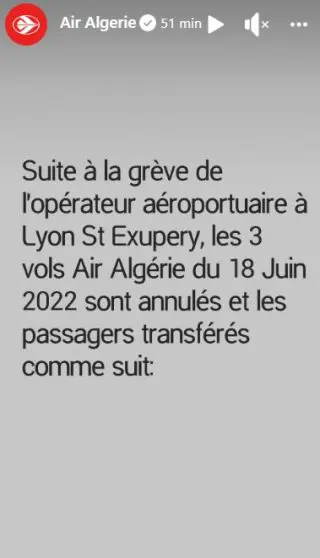 Air Algérie n’a pas manqué de noter que « le vol AH1036 du 19/06/22 Alger Lyon prévu à 9h30 est décalé à 16h40, le vol AH1037 Lyon Alger du 19/02/22 prévu à 13h35 est décalé à 21h00 ».