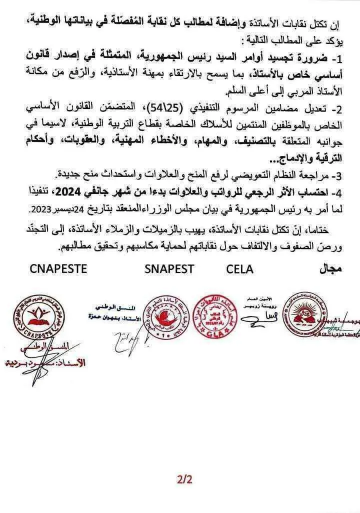 Quatre syndicats – le Cnapeste, le Snapeste, le CELA et Majal – ont annoncé, hier, une grève de deux jours les 11 et 12 février, accompagnée de sit-in à travers les wilayas.