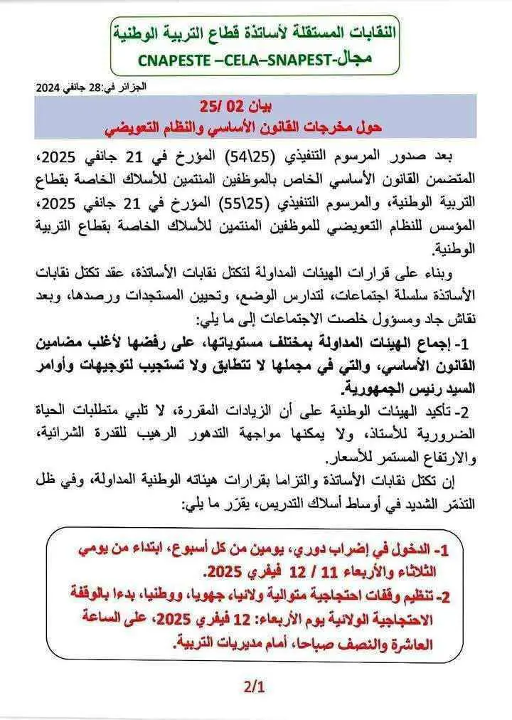 En réponse, la coalition a décidé de lancer une grève cyclique de deux jours, renouvelable chaque semaine, à partir du mardi 11 février. Des sit-in seront également organisés aux niveaux local, régional et national, devant les directions de l’éducation.
