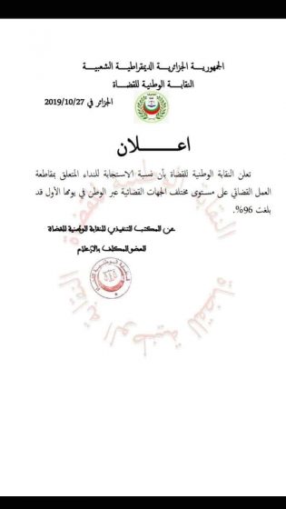 Selon un communiqué diffusé par le syndicat national des magistrats, la grève pour laquelle ce dernier a appelé a généré un taux de suivi de 96%. Seule la cour de Tindouf s’est désolidarisée de ce mouvement de grève.