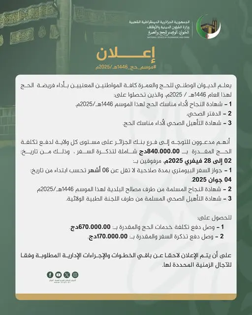 Avec un coût total de 840 000 DA, incluant le billet d’avion, les candidats au voyage sacré devront respecter un calendrier précis et fournir plusieurs documents essentiels. Voici tous les détails à savoir.
