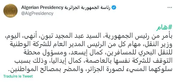 À la suite de ce scandale, le Président Tebboune a décidé de limoger le PDG d’ENTMV-Algerie Ferries, Kamel Issad et du responsable de l’escale à Alger, Kamel Idalia en raison de leur comportement « offensant pour l’image de l’Algérie et préjudiciable aux intérêts des citoyens ».