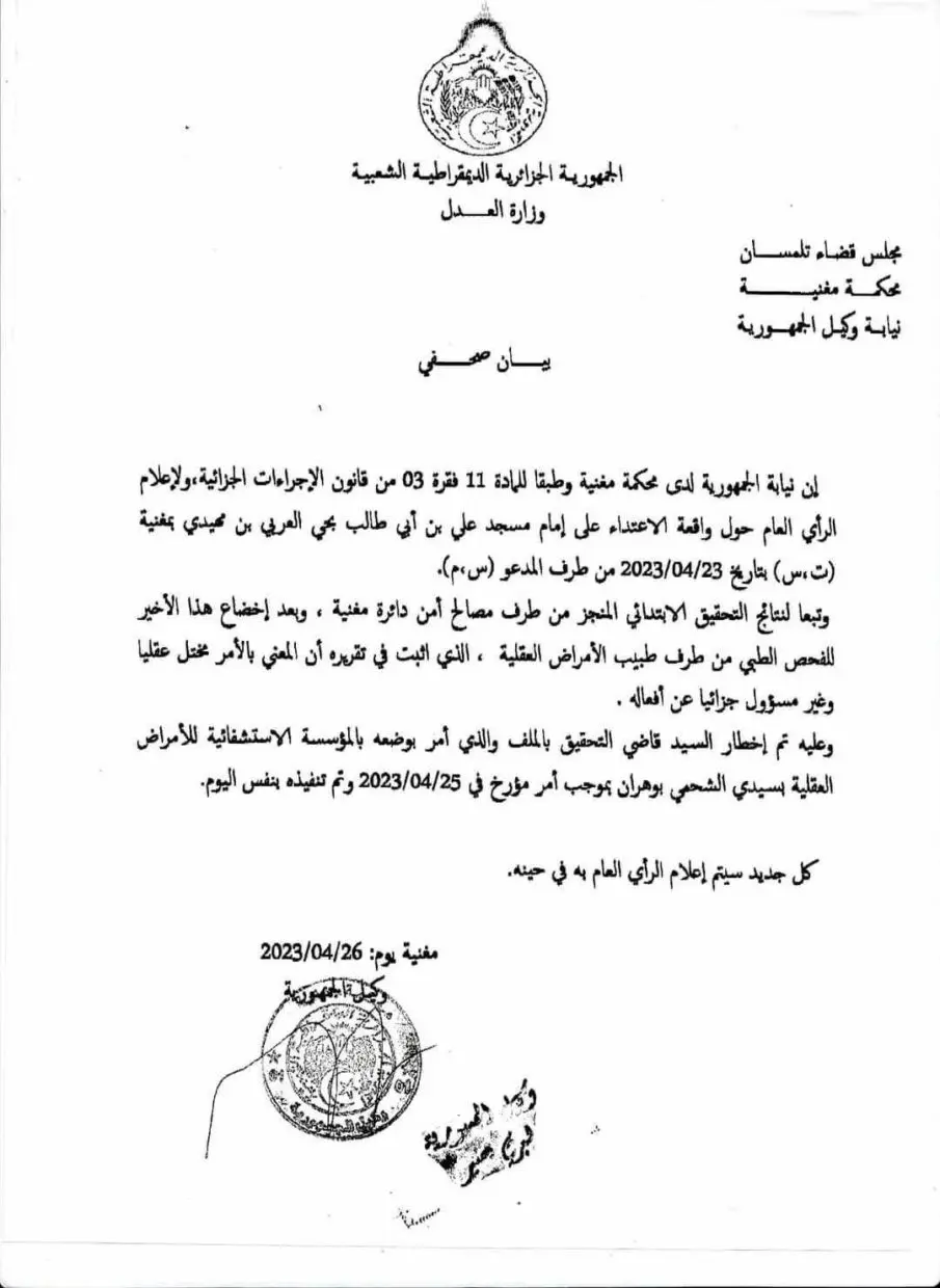 Par le biais d’un communiqué rendu public aujourd’hui par la cour de la wilaya de Tlemcen, cette dernière a donné plus de détails concernant l’agression de l’imam de la mosquée Ali Ben Abi Taleb, situé dans le quartier de l’Arbi Ben M’hidi à Maghnia le 23/04/2023 par une personne qui répond aux initiales « S.M. ».