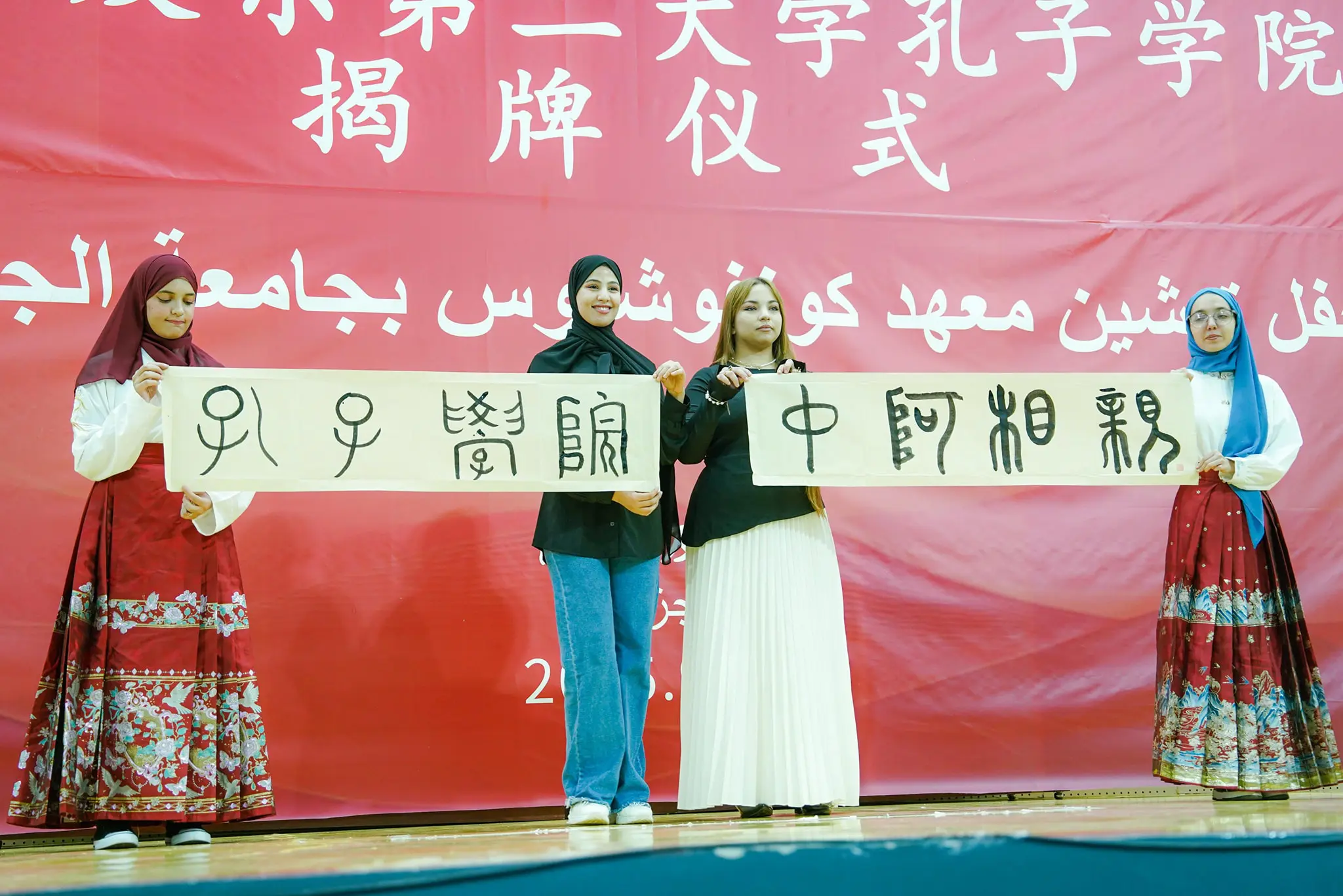 Après la levée de voile sur la plaque inaugurale, les invités ont assisté à un programme artistique riche et varié. Le département de chinois de l’Université d’Alger 2 et la troupe artistique venue de l’Université normale du Nord-Ouest de Chine ont proposé des récitations poétiques, chants, danses traditionnelles et démonstrations de calligraphie, mettant en lumière la richesse des arts chinois et l’intérêt croissant des jeunes algériens pour cette civilisation millénaire.