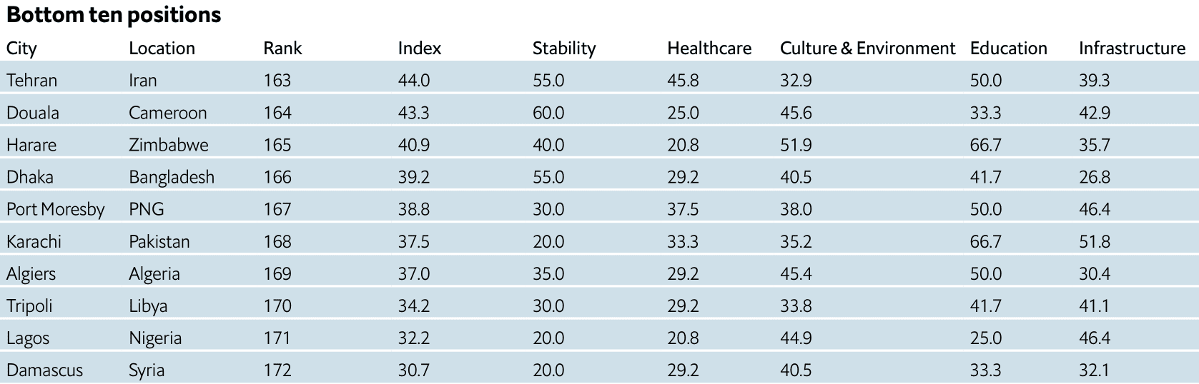 En 2022, les conditions de vie restent les plus mauvaises à Damas, la capitale de la Syrie. Tripoli (Libye), Lagos (Nigeria) et Alger (Algérie), qui continuent d’obtenir des résultats médiocres dans les cinq critères, figurent également dans le bas du classement.