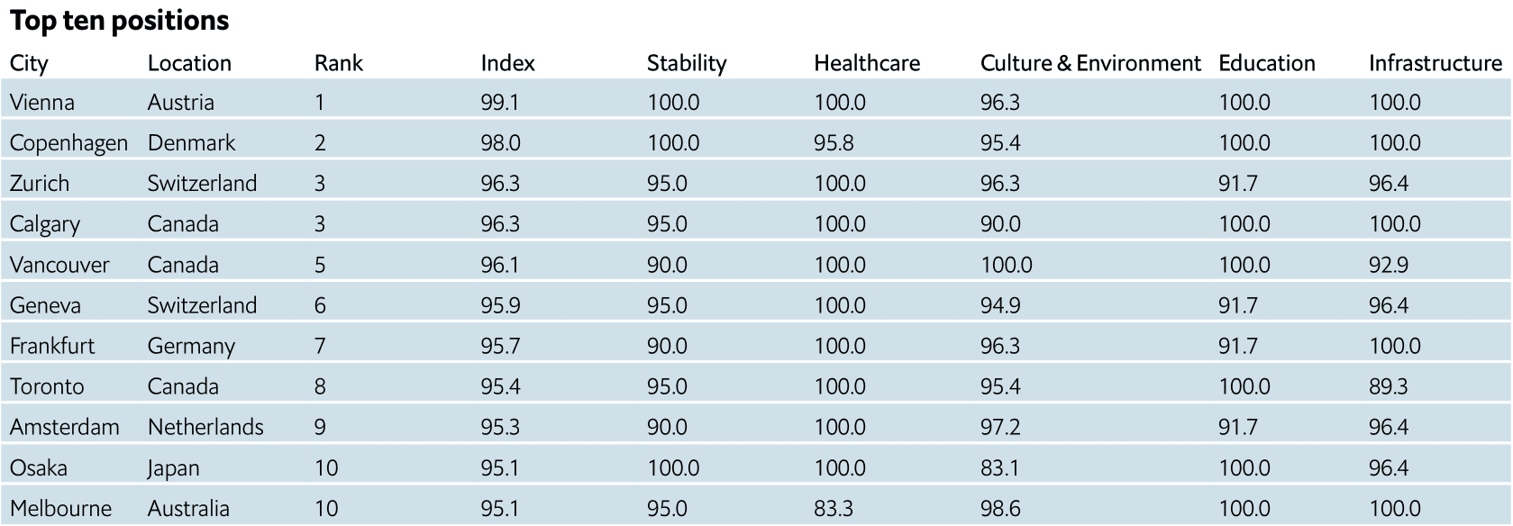 Le top 10 du Global Liveability Index reste dominé par les villes d’Europe occidentale et du Canada. C’est ainsi que nous retrouvons sur le podium : Vienne (Autriche), Copenhague (Danemark) et Zurich (Suisse). D’une manière générale, les villes moyennes des pays riches s’en sortent exceptionnellement bien.