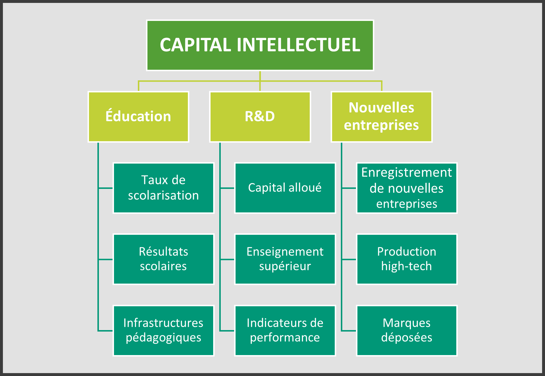 Par ailleurs, l’indice du capital intellectuel, aussi appelé indice du capital-innovation, se base sur trois principaux indicateurs : l’éducation, la recherche-développement et les nouvelles entreprises. Chacun de ces indicateurs comprend trois critères, selon le schéma suivant :