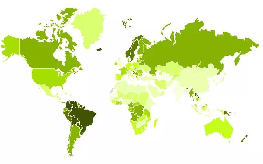 Carte mondiale de l’indice du capital naturel 2021 – Foncé : note élevée ; Clair : note faible © solability.com