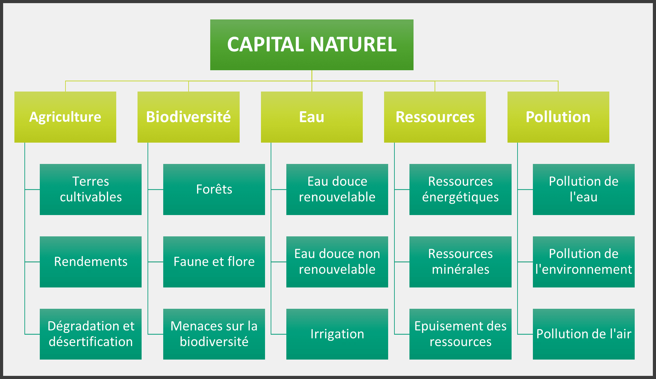 Le capital naturel d’un pays se définit par la composition de son environnement physique. C’est un modèle qui intègre l’essentiel des ressources qui permettent à un pays d’être autonome : la terre, l’eau, le climat, la biodiversité, l’agriculture, les ressources énergétiques et minérales. En outre, l’indice du capital naturel prend en compte le niveau d’épuisement ou de dégradation des ressources qui pourrait, dans le futur, mettre en danger l’autosuffisance de la nation.