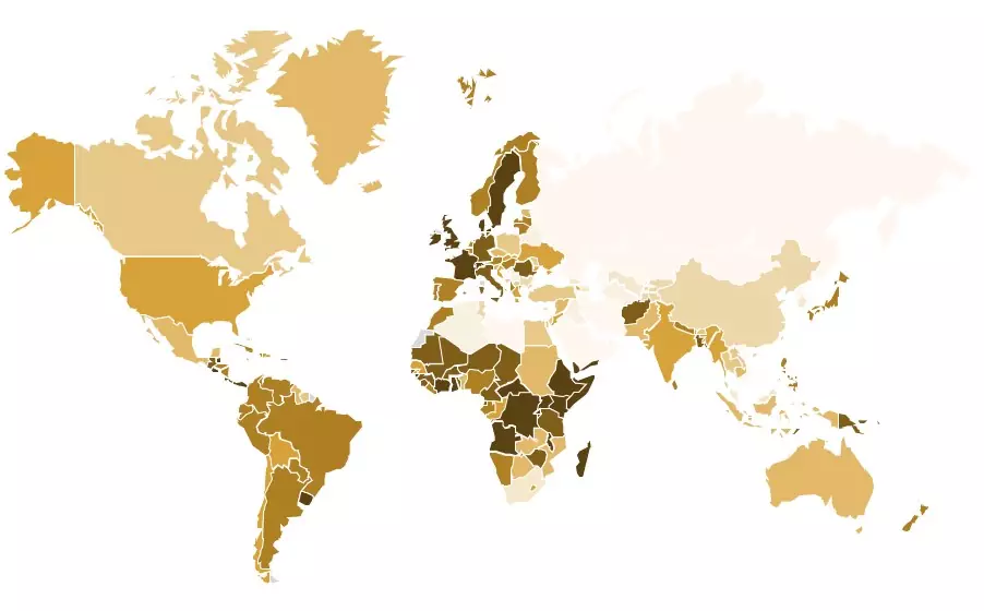 Carte du monde de l’indice de l’efficacité la gestions des ressources 2021 | Foncé : gestion efficace ; Clair : gestion inefficace (Source : solability.com)