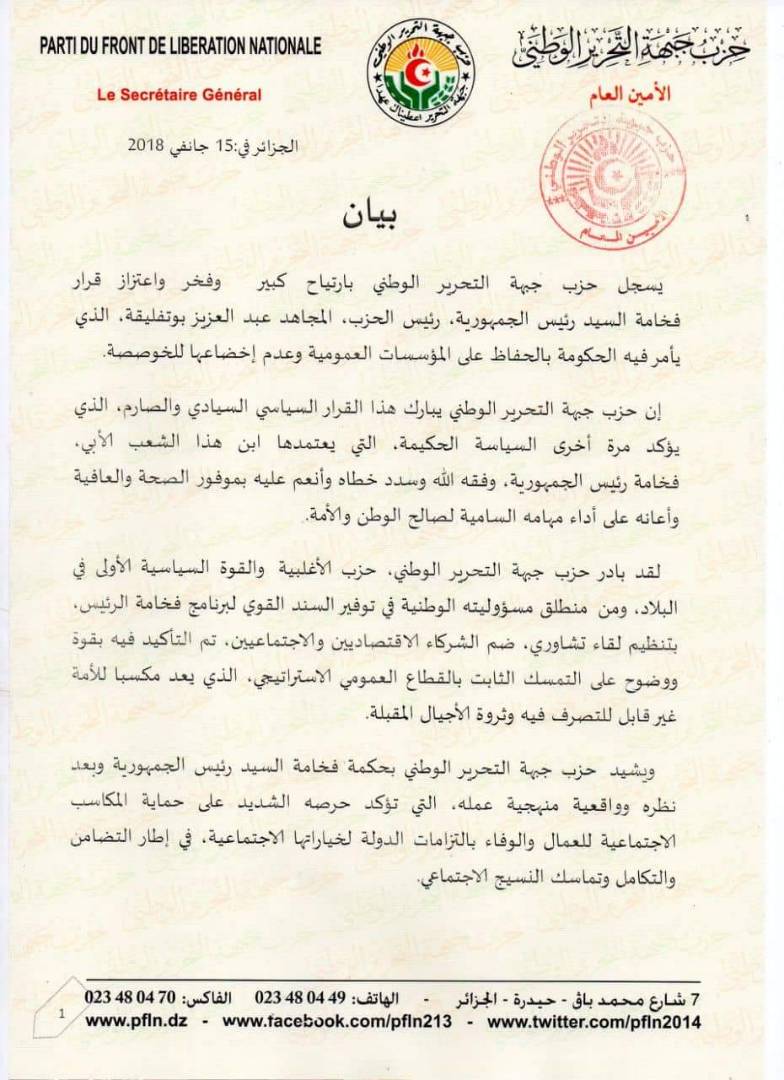 A cet effet, le FLN “salue cette décision politique souveraine et stricte qui réaffirme, une fois de plus, la politique lucide adoptée” par Bouteflika.